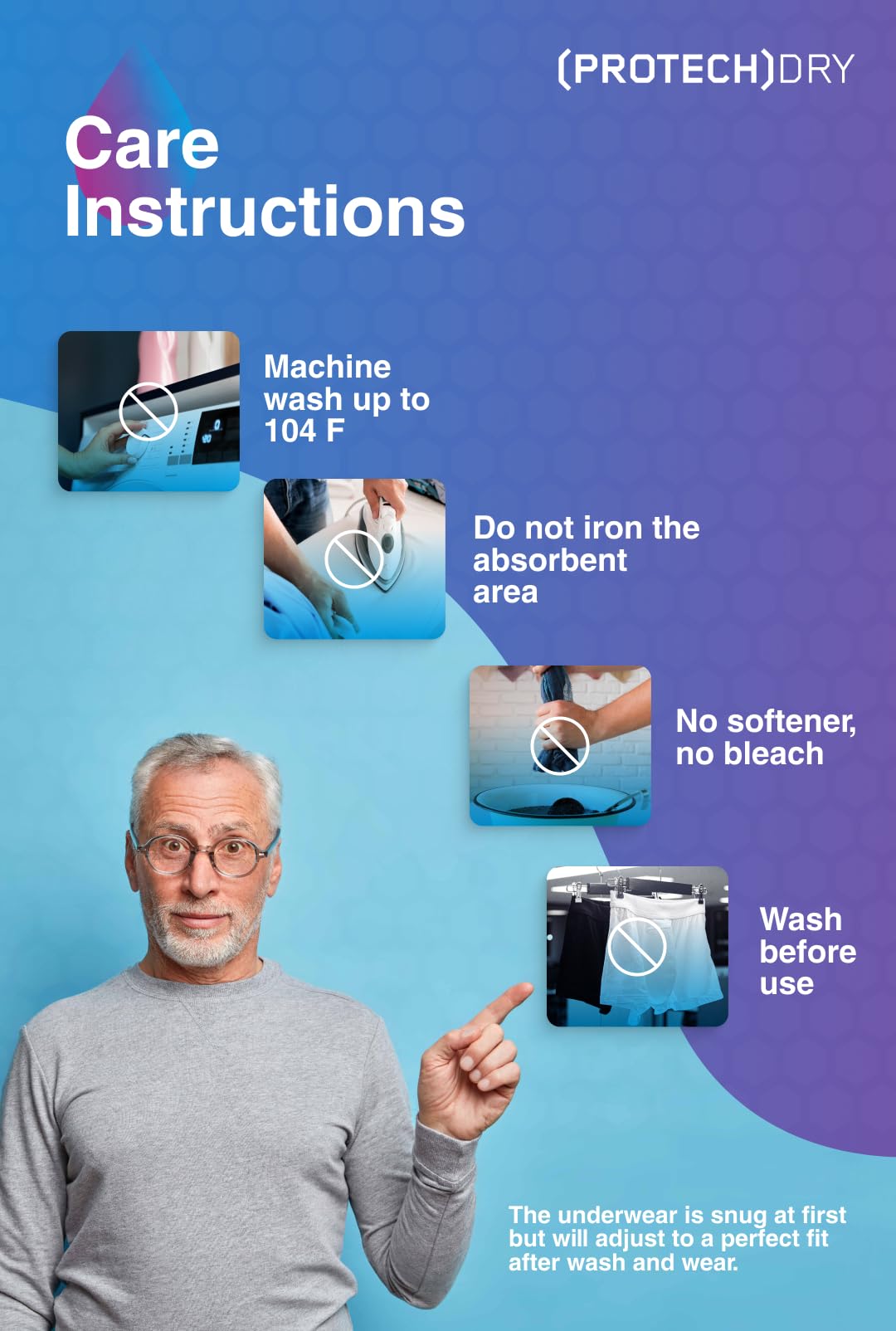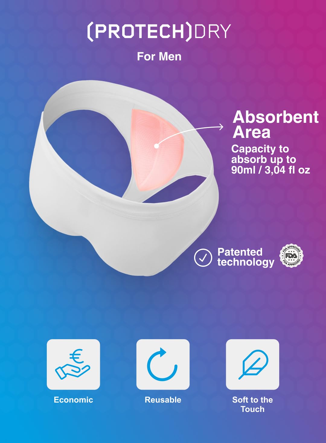 - BUILT IN ABSORPTION AREA - WASHABLE AND REUSABLE- Withstand at least 100 washes - 1 PROTECHDRY = 100 Disposable Underwear. PERFECT FIT & SEALED SEAMS - 5 sizes available for a perfect form fit. Innovative technology which prevents liquids from leaking through.
