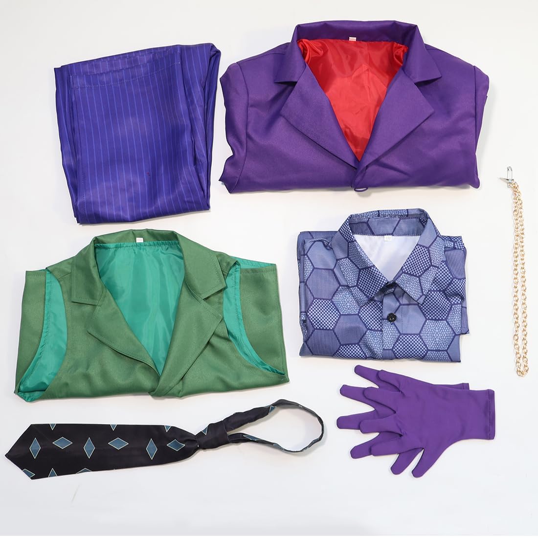 - 【Clown Costume】The evil clown costume set includes a purple clown jacket, a hexagonal shirt with different patterns, a green vest, gloves, a tie, and striped pants. The combination is complete and can meet any of your holiday dress-up needs.