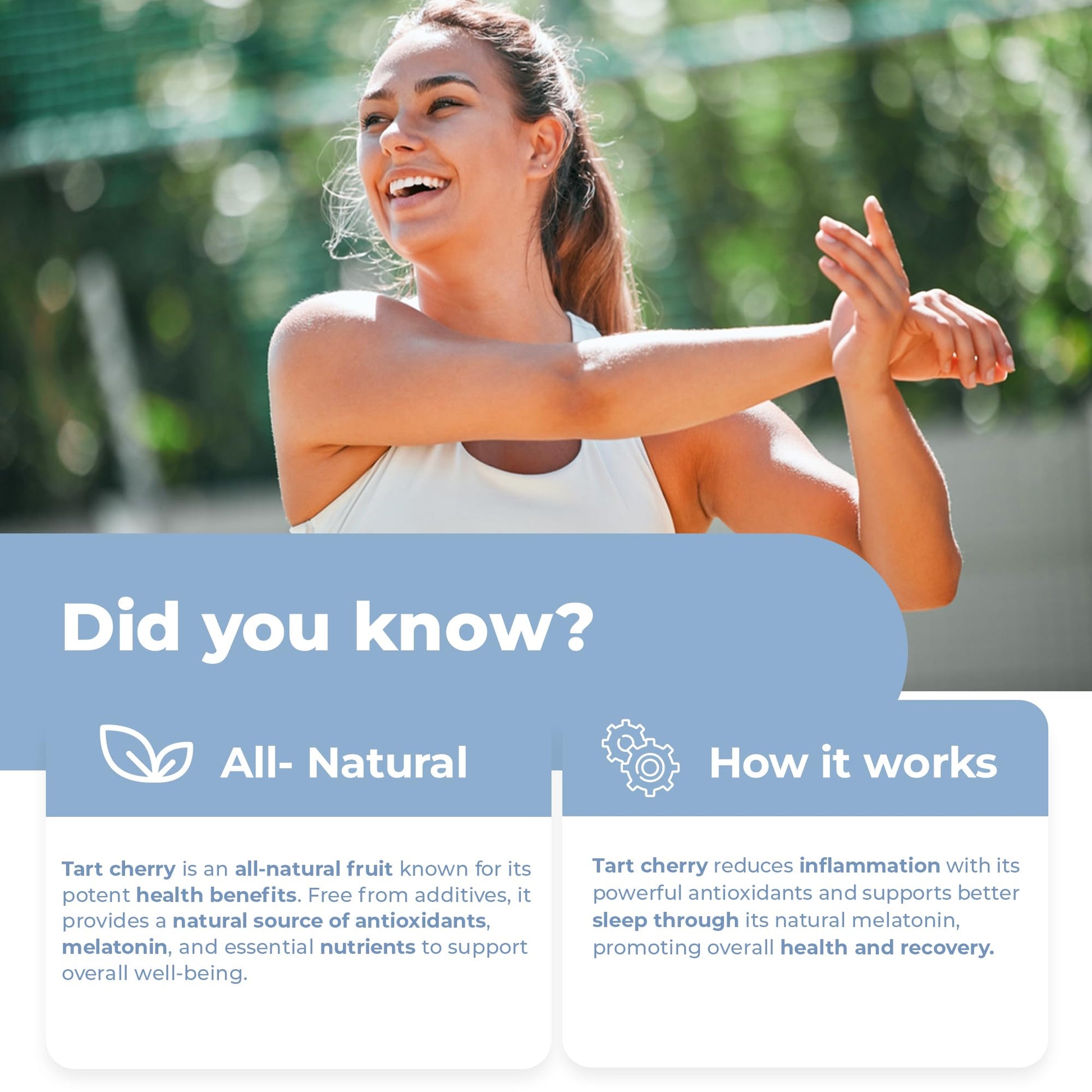 - EXERCISE RECOVERY AND IMMUNE SUPPORT: Research indicates that the consumption of Tart Cherry may help reduce muscle soreness and recovery time after intense exercise. Tart Cherry is believed to support immune function due to its high antioxidant content.