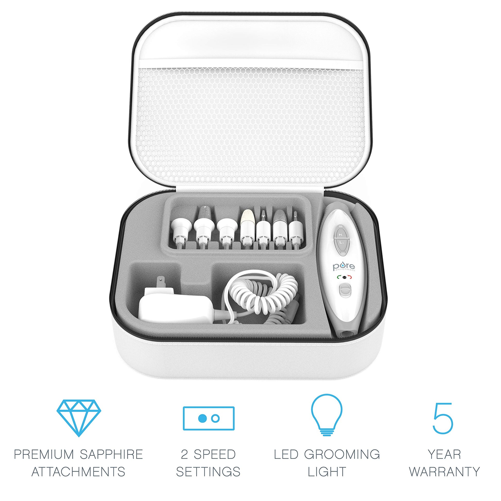 - Includes 7 interchangeable sapphire-coated attachments that effectively smooth corns and calluses, remove excess cuticles, and file, shape and buff nails