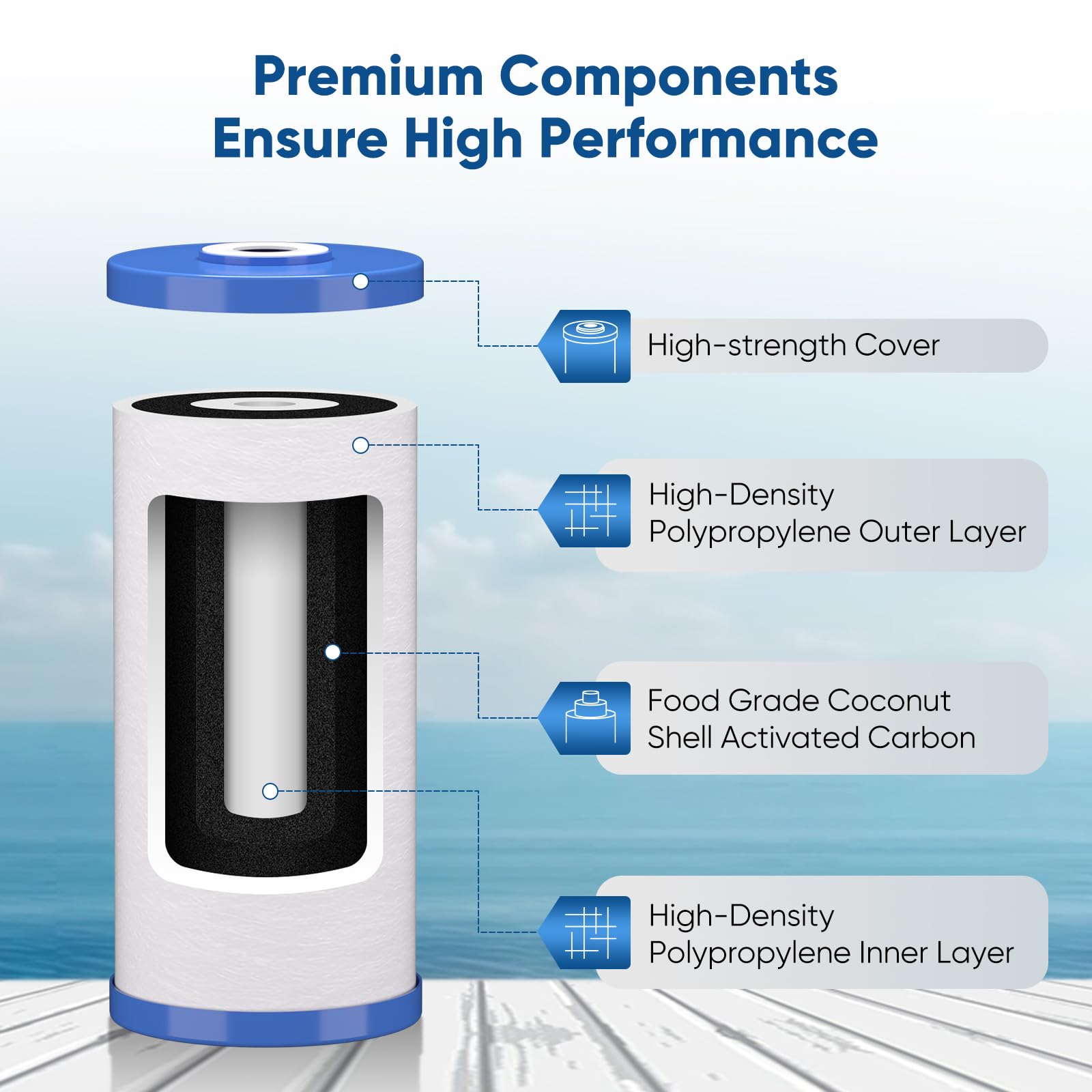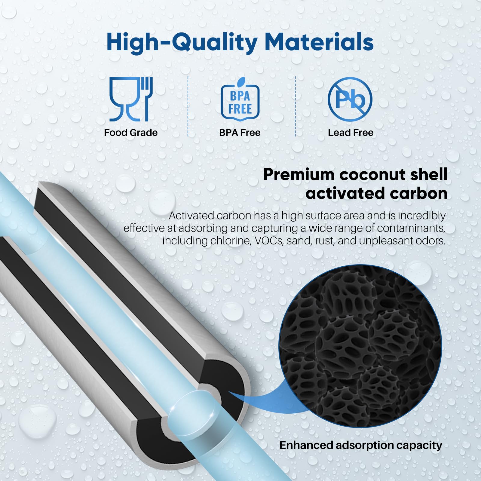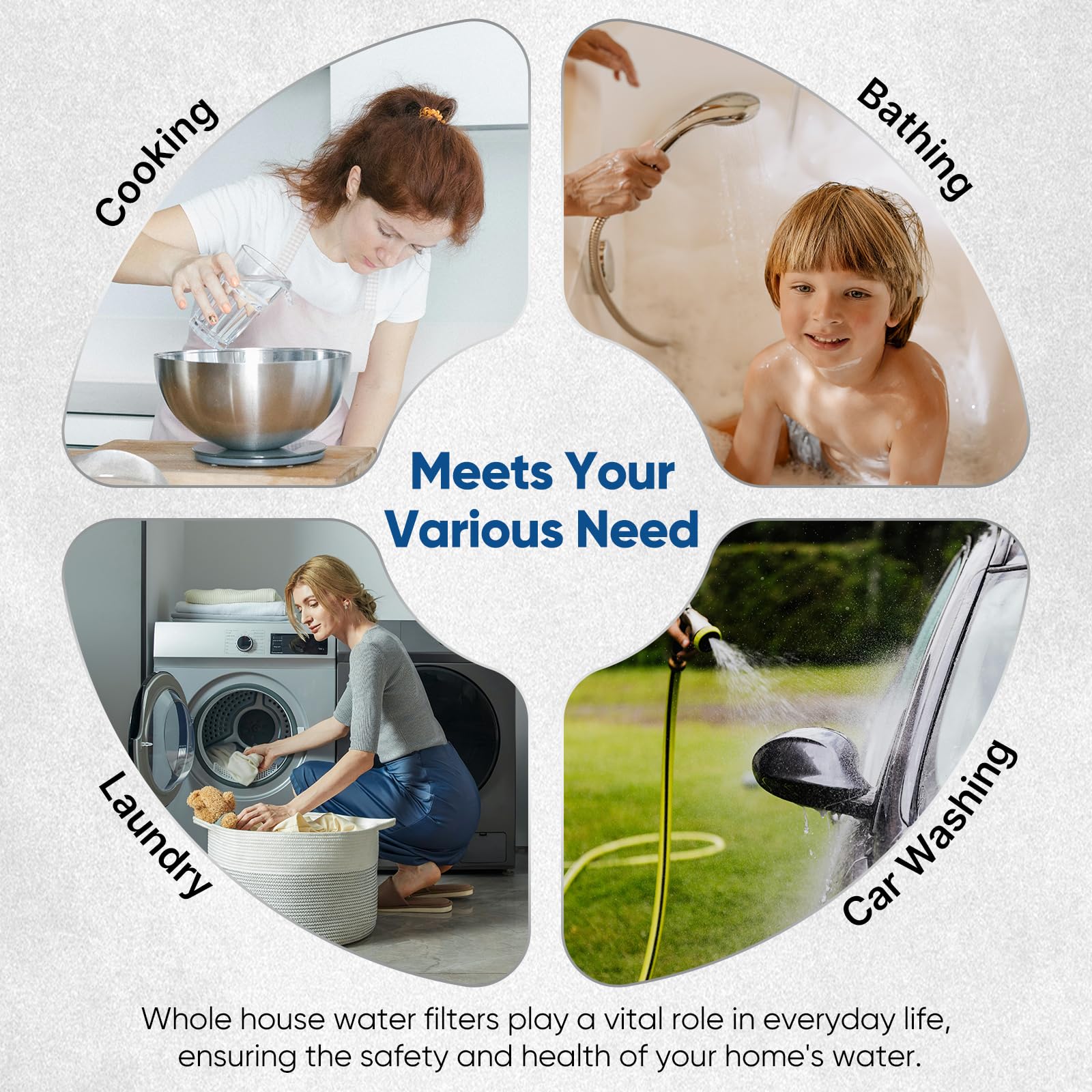 - 【Multi-Layer Density Tech】The whole house water filter is designed with density three PP layers and Coconut Shell Activated Carbon Layer to remove most contaminants and deliver great fresh water. The multi-layer density tech can capture impurities targetedly and have 30% longer service life than the other common type.
