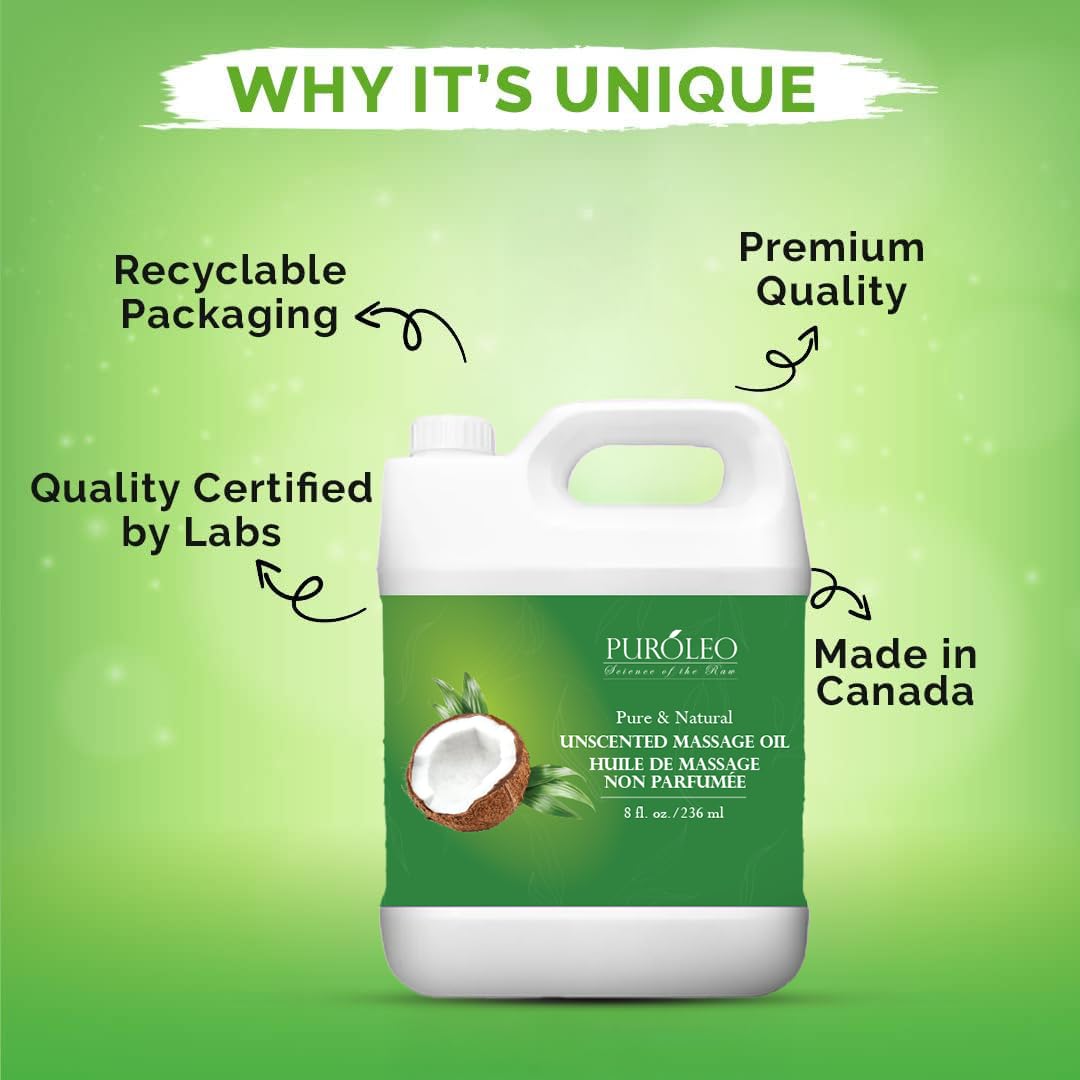 - ALL-NATURAL MASSAGE OIL: PUROLEO Unscented Massage Oil is made with a blend of premium oils like coconut, almond, and jojoba to provide nourishing benefits for your skin and hair.