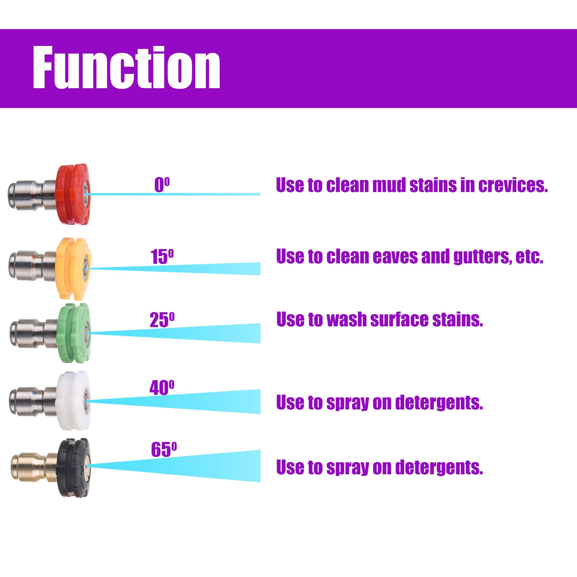 - Spray Nozzles: 5 Pressure washer nozzles with 5 different angles: 0°,15°,25°,40°,65°. Different nozzle meets different needs. Multiple cleaning modes, such as washing car, surface drain, window, roof, gutter, floor, etc.