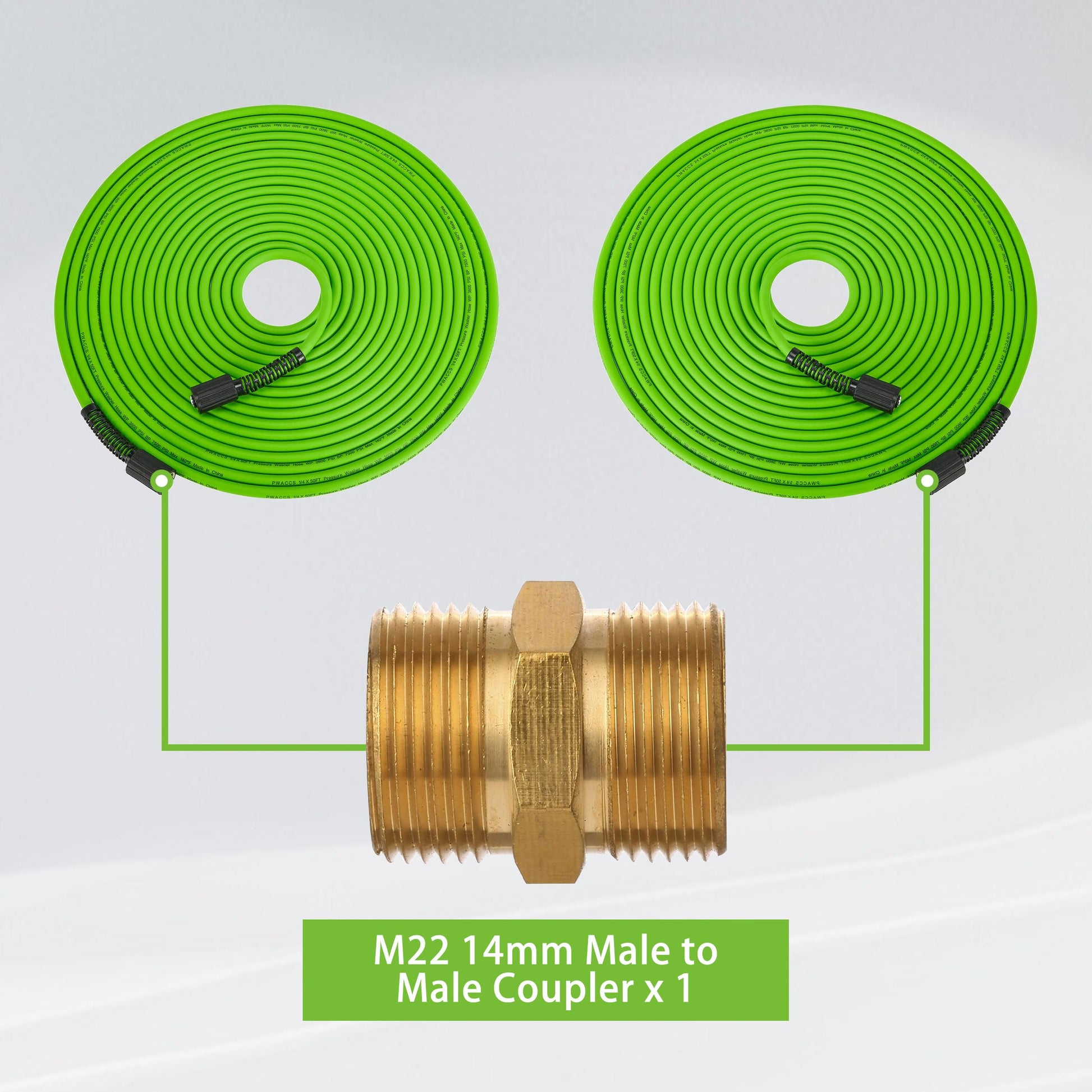 - FULLY EQUIPPED — The package contains a 50 ft power washer hose and 5 adapters to deal with most cases. The coupler (M22 14mm Male to M22 14mm Male) is used for connecting two hoses. Other two adapter set (M22 14mm Female to 3/8” Quick Connect Plug and M22 14mm Male to 3/8” Quick Connect Socket) is used for connect QC fittings.