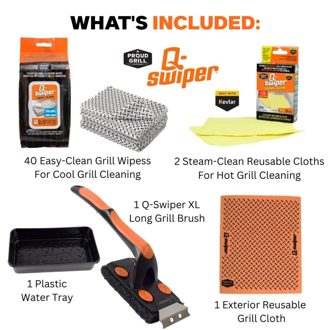 Q-Swiper XL Complete Grill Cleaner Kit - Hot + Cold + Exterior Grill Cleaning. Includes 1 Long Grill Brush, 2 Steam Clean Cloths, 40 Moist Grill Wipes, 1 Exterior Reusable Cloth and 1 Tray.