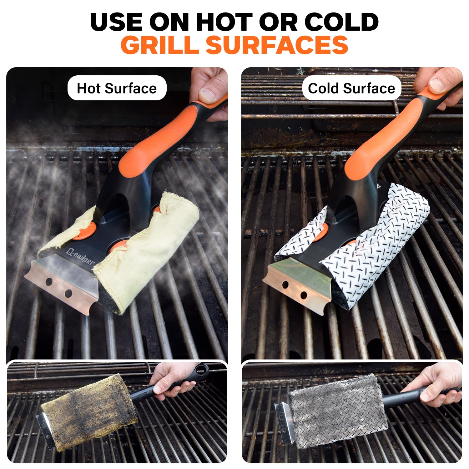 - VERSATILE FOR ALL GRILL TYPES - our Q-Swiper Easy-Clean wipes and Steam-Clean cloths can be used on all grill types and surfaces. Cleans surfaces on gas grills, smokers, griddles, charcoal grills. Safe to use on stainless steel, porcelain coated, cast iron and even pizza stones. Ideal for all major Brands including Weber, Traeger, Blackstone, Broil King and Napoleon.