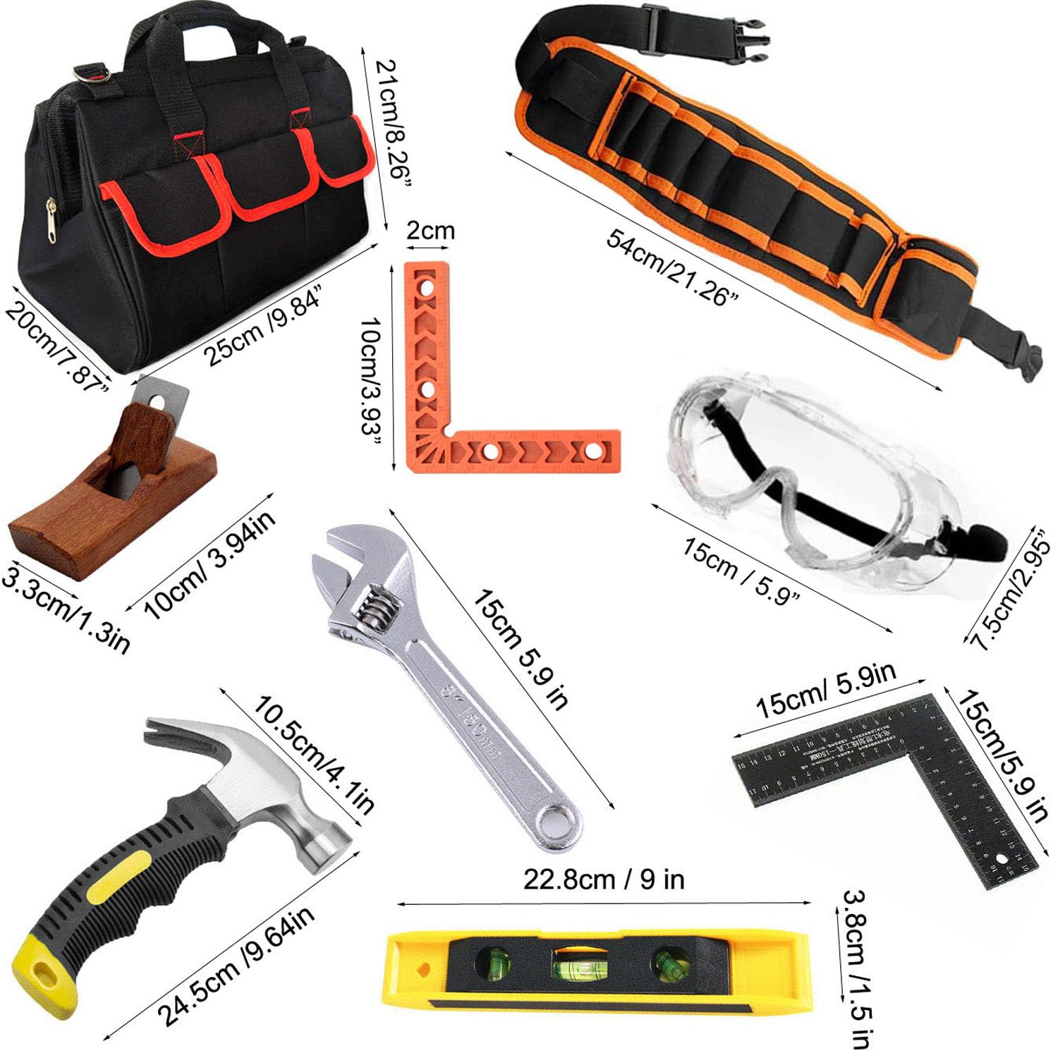 - [What you get] This kids tool set comes with 18 pieces, including tool bag, tool belt, goggles, gloves, hammer, a screwdriver, Phillips screwdriver, pliers, saw, saw blades, spirit level, L-shape woodworking ruler, tape measure, woodworker's positioner, woodworking clamps, mini carpenter's plane.