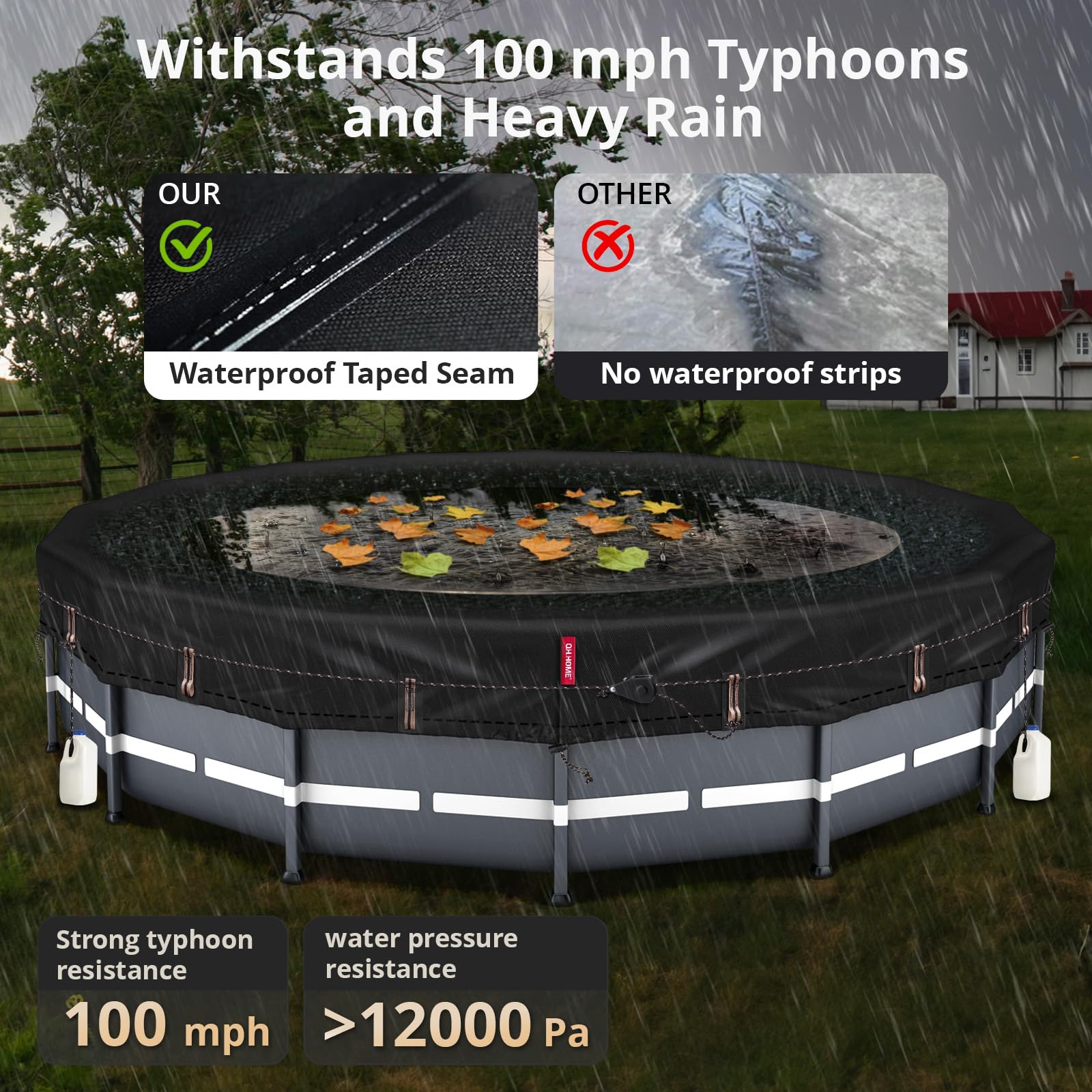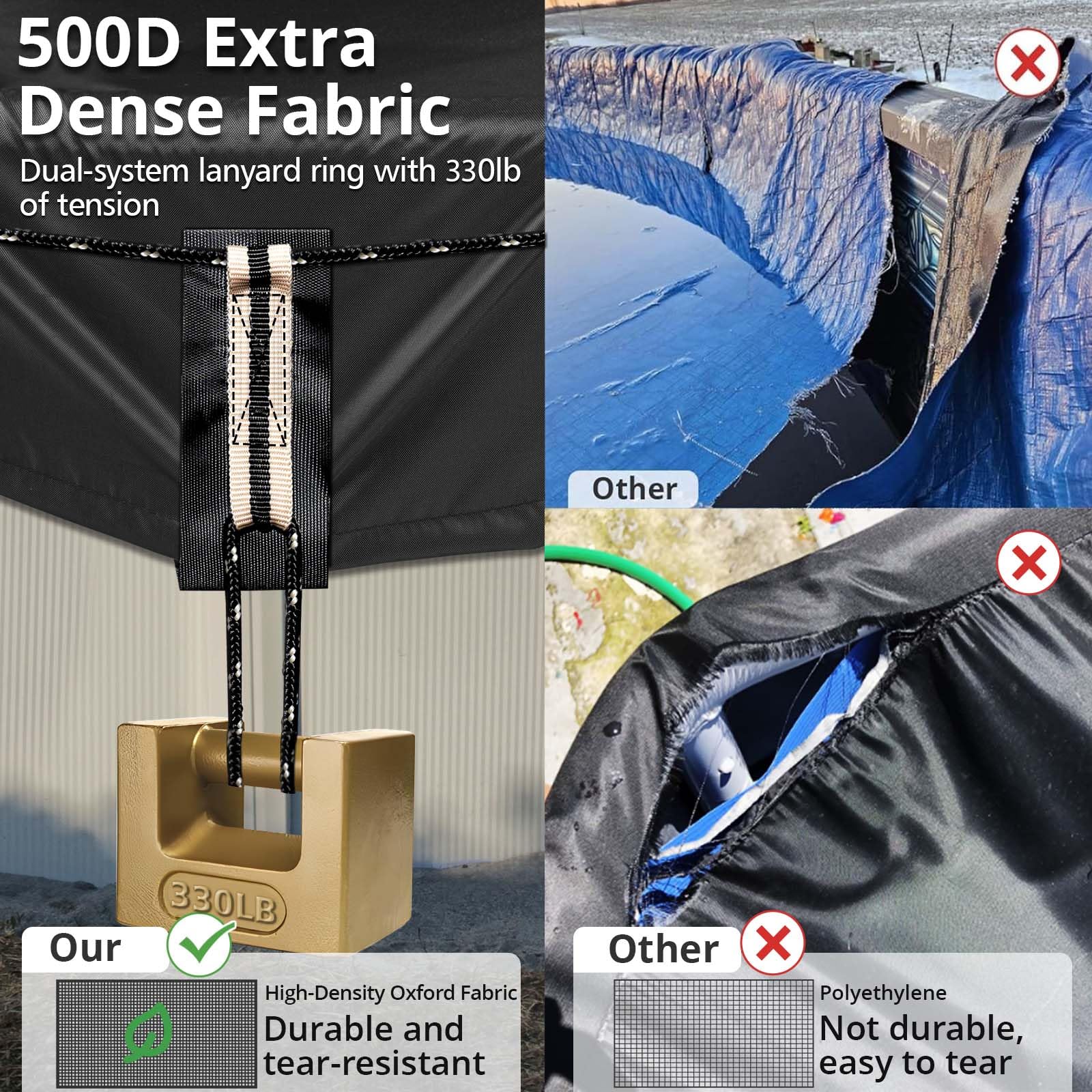- 【Upgraded Tear Resistant Design】The edges of our round pool cover are designed with a lay-flat seamless design (no risk of edge cracking compared to traditional double stitching). Upgraded 500D Oxford fabric has a tear strength of 330 lbs (lab test), which increases the durability by 3 times, far more than 420D/210D fabrics, ensuring the pool cover is stable for long-term use.