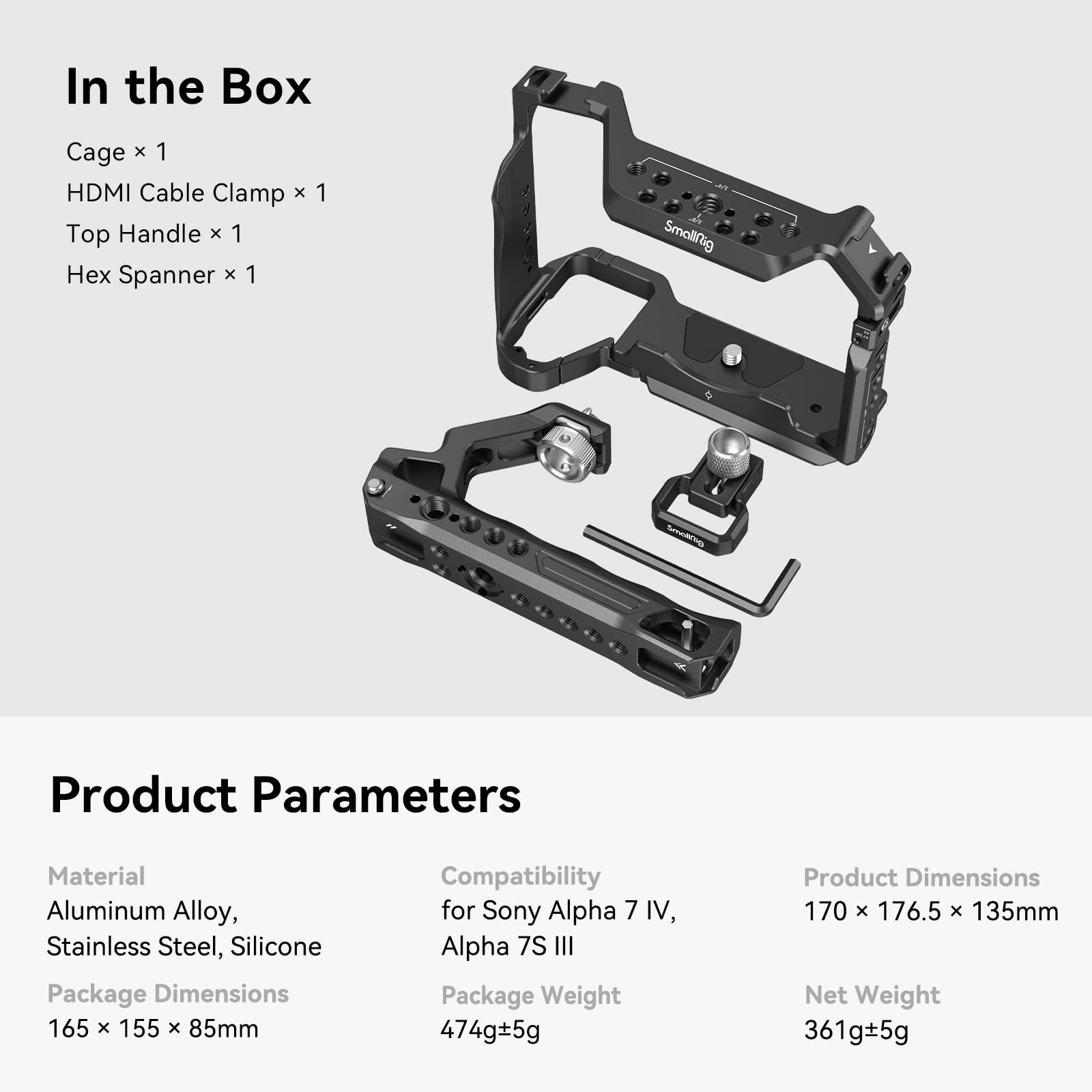 - For Sony A7 IV / A7S III: SMALLRIG Basic Kit for Sony Alpha 7 IV/Alpha 7 S III 3668 is designed to facilitate low-angle shots and protect the camera while offering a wide range of accessory mounts. It includes a cage, an cable clamp for HDMI, and a top handle.